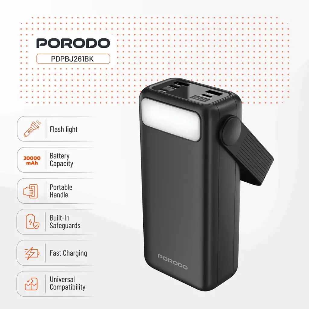 پاوربانک فست شارژ 30000میلی آمپر چراغ اضطراری نمایشگردار پرودو porodo-lara-30000mah-power-bank-with-integrated-cables-flashlight-pdpbj261bk