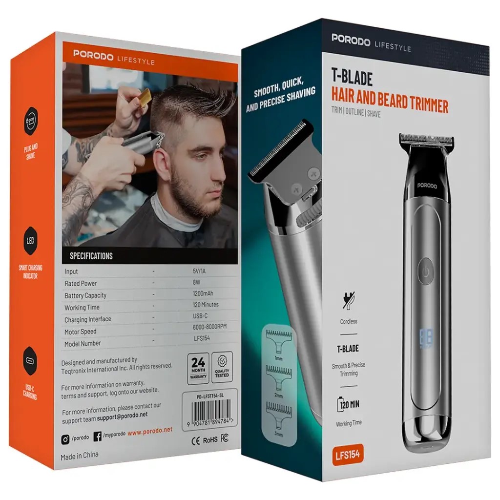 ماشین اصلاح مو و ریش Porodo Lifestyle T-Blade دارای دقت و سرعتی است که در روشهای اصلاح صورت مورد نیاز است. این ماشین اصلاح با ظرفیت باتری ۱۲۰۰ میلیآمپر ساعت، با یک بار شارژ، حدود ۱۲۰ دقیقه کار میکند. سرعت موتور آن ۶۰۰۰-۸۰۰۰ دور در دقیقه، اصلاح بسیار نرمی را چه برای مو و چه برای ریش تضمین میکند. تیغه T شکل، برشهای تمیز و دقیقی را تضمین میکند. یک نشانگر شارژ هوشمند وجود دارد که هنگام نیاز به شارژ، اطلاع میدهد. همچنین دارای یک پورت شارژ USB-C است تا شارژ سریع و آسان باشد. با توجه به استفاده، این ماشین اصلاح بیسیم بیشترین آزادی و سهولت را چه در خانه و چه در جاده فراهم میکند. با توان ۸ وات، ماشین اصلاح Porodo Lifestyle T-Blade برای حفظ ظاهری مرتب و آراسته عالی است و همیشه نتایج حرفهای ارائه میدهد.